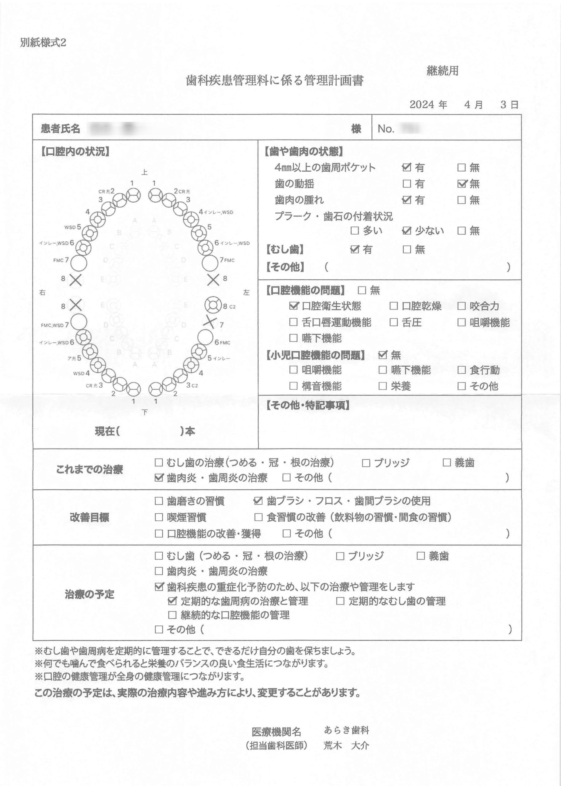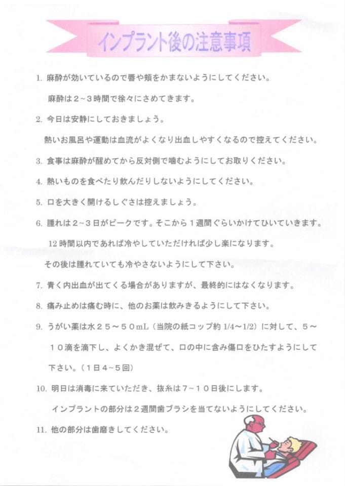 その後、歯科衛生士の方からインプラント後の注意点を書いた紙