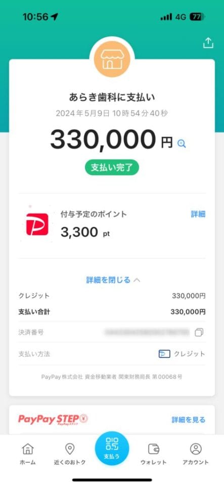 抗生物質と痛み止め(カロナール)、うがい薬(コンクールの試供品)、滅菌ガーゼを頂きPayPayで330,000円支払う