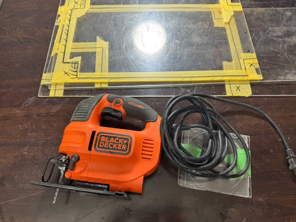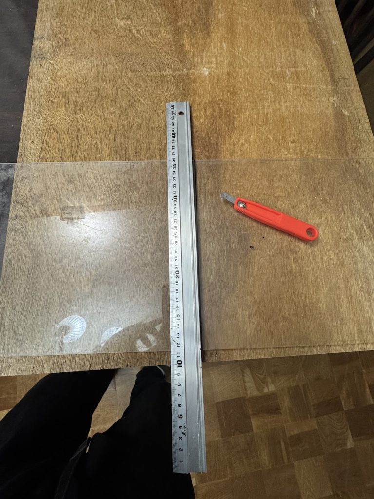 段ボールで型をとってその大きさにアクリル板を切り取っていきます
