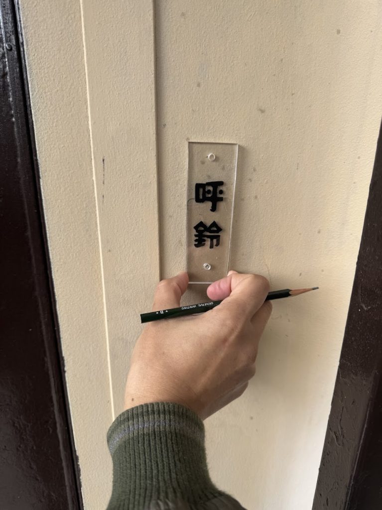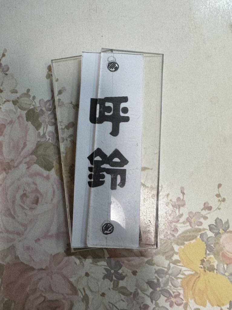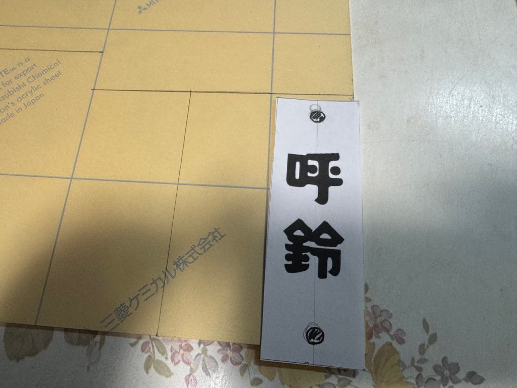 目立つように廃材のアクリル板で「呼鈴」と書いたプレートを作っていきます